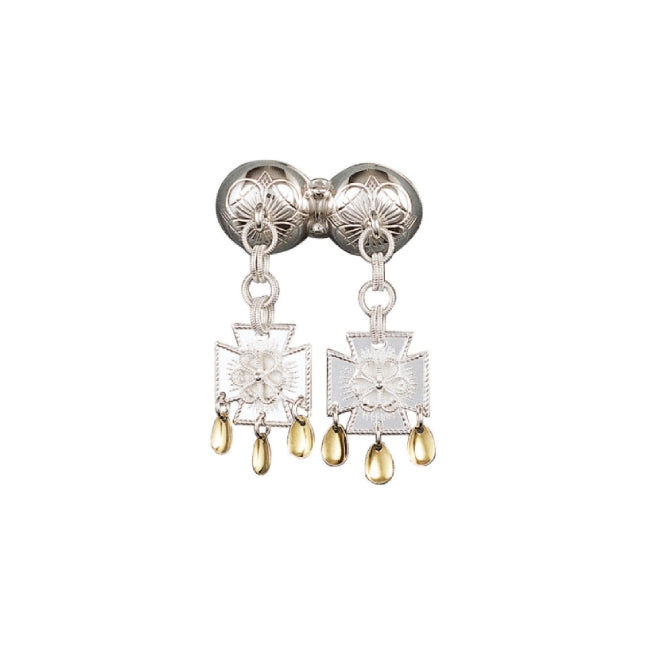 Dobbel halssølje i blankt sølv med rosettdekor og korsløvheng, som i hovedsak blir brukt til damebunad.