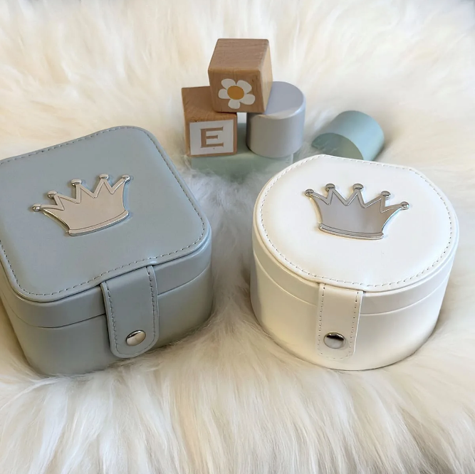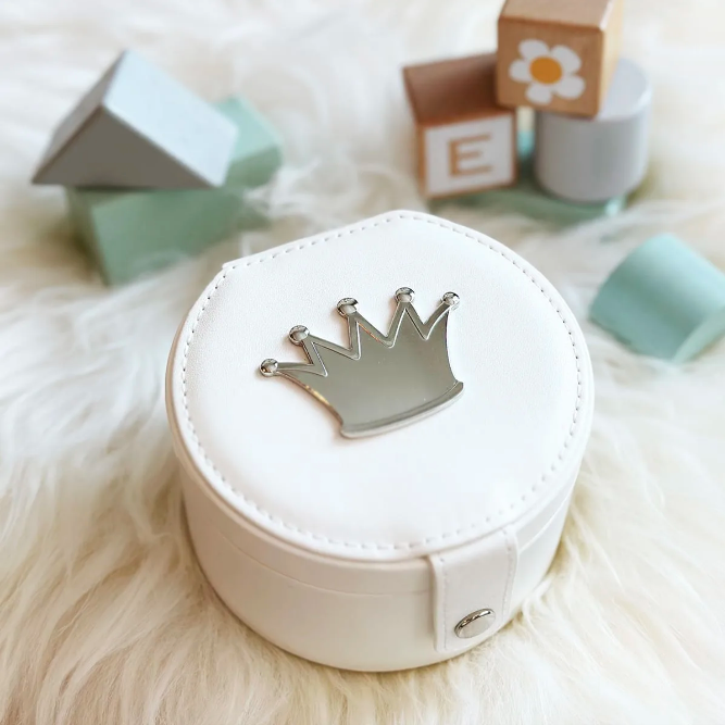 Hvitt smykkeskrin i kunstig skinn, med grått innlegg. Kronen på lokket er produsert i ekte tinn, i EIKs lokaler i Tønsberg. Den kan graveres med navn og dato. Selve skrinet er produsert for EIK i Asia. Leveres i gaveeske.