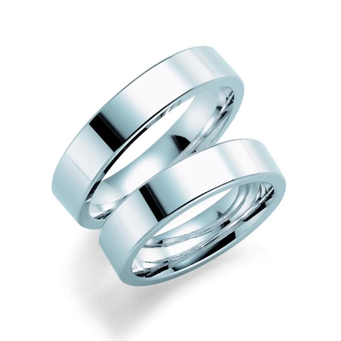 5 mm bred giftering med rhodinert overflate i 585 hvitt gull. Ringen er buet på innsiden og har en ringskinne med 1,9 mm høyde. At modellen er innvendig buet gjør at den føles mykere, luftigere og mer behagelig å bære. Samtidig ser ringen kraftigere ut fordi den innvendige buen gjør at ringen blir tykkere.