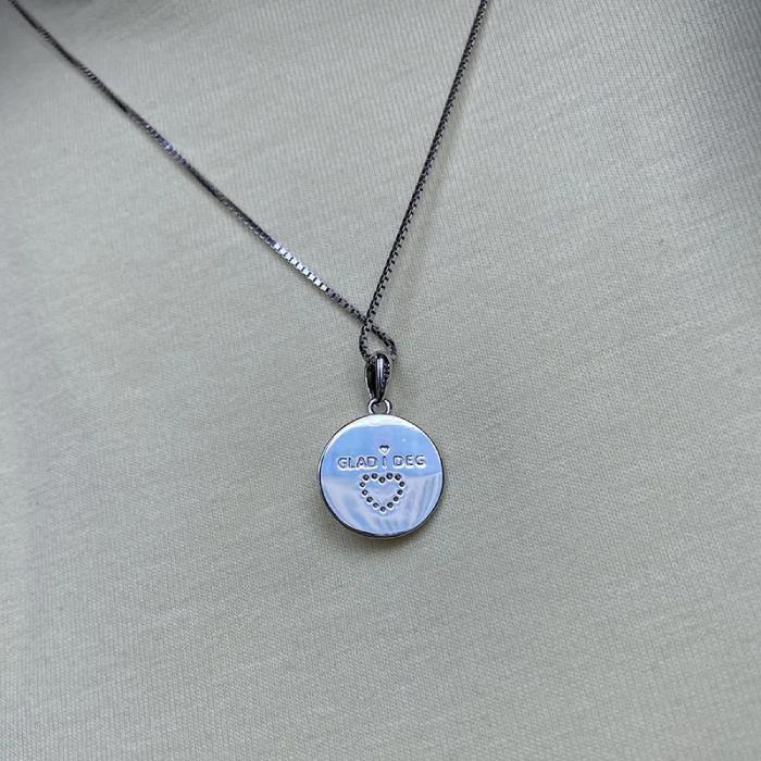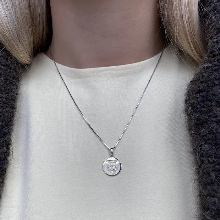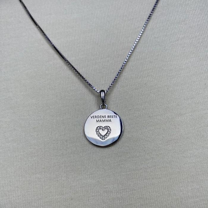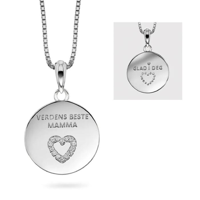 Smykke i sølv med teksten "Verdens beste mamma" på ene siden og "Glad i deg" på andre siden, med glitrende zirkonia - et symbol på kjærlighet og takknemlighet. Perfekt som gave til morsdagen, en bursdag, eller bare som en spontan påminnelse om hvor mye hun betyr.