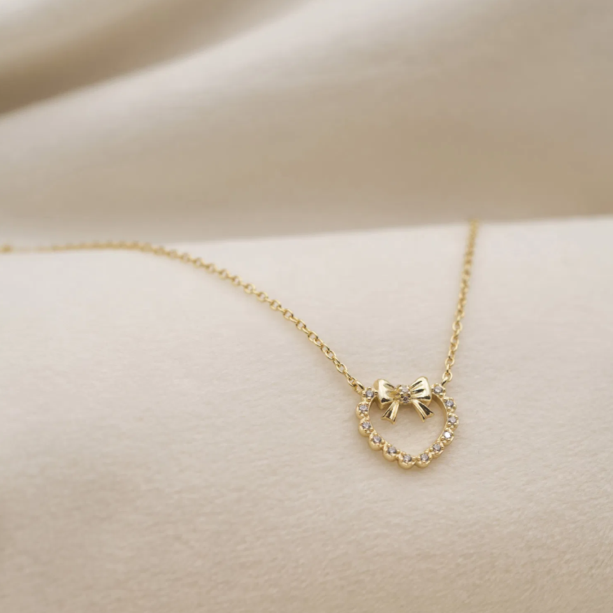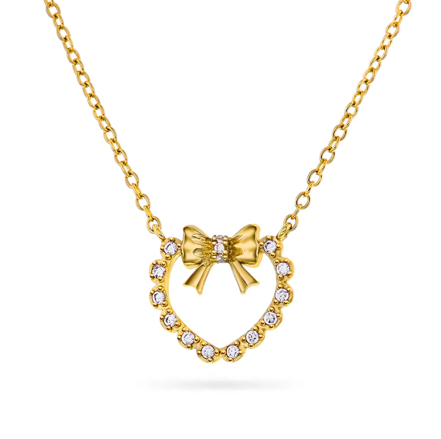 Søtt hjertesmykke dekorert med hvit zirkonia og sløyfe. Tilsvarende smykke fåes i rhodinert sølv.