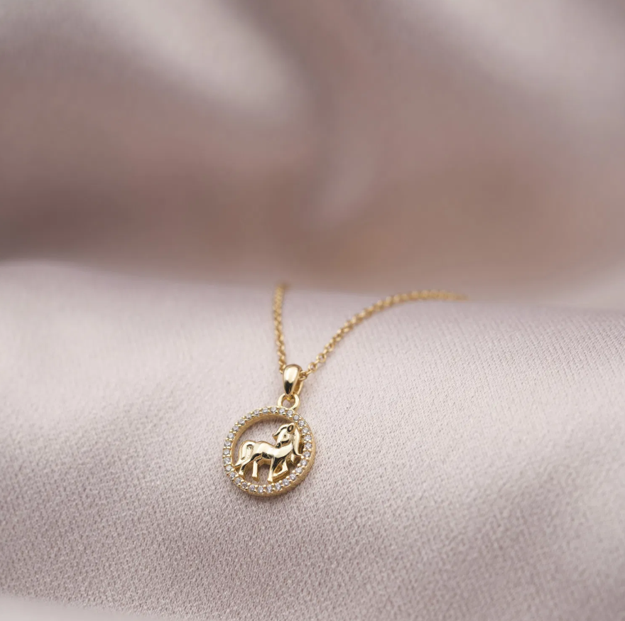 Søtt hestesmykke dekorert med sirkel av hvit zirkonia.