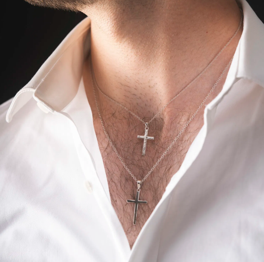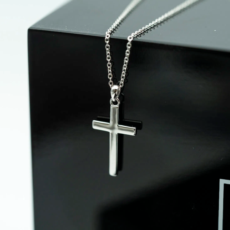 Klassisk og tidløst kors med ankerkjede i 50 cm. Høyde på anheng er 28 mm og bredde 13 mm. Finnes også i forgylt.
