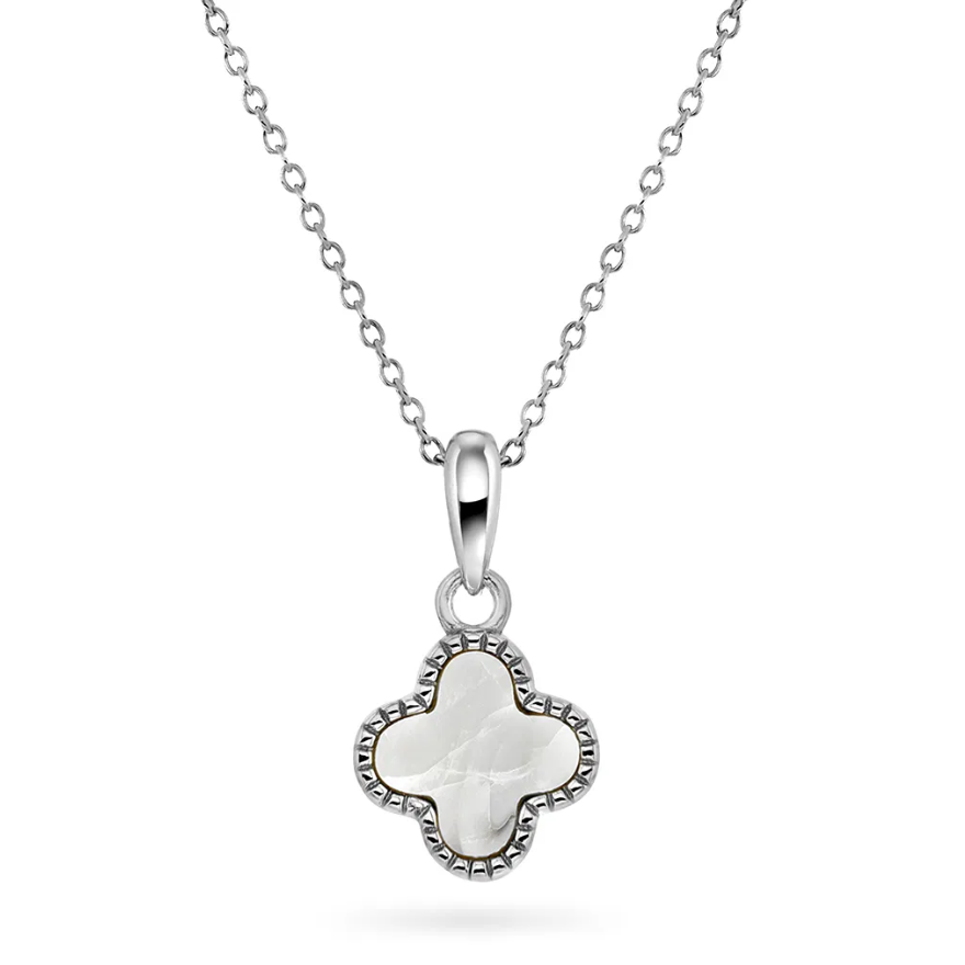 Lekkert smykke i sølv med kløver av hvit perlemor. Kommer med tilhørende øredobber og armbånd, samt i flere farger.