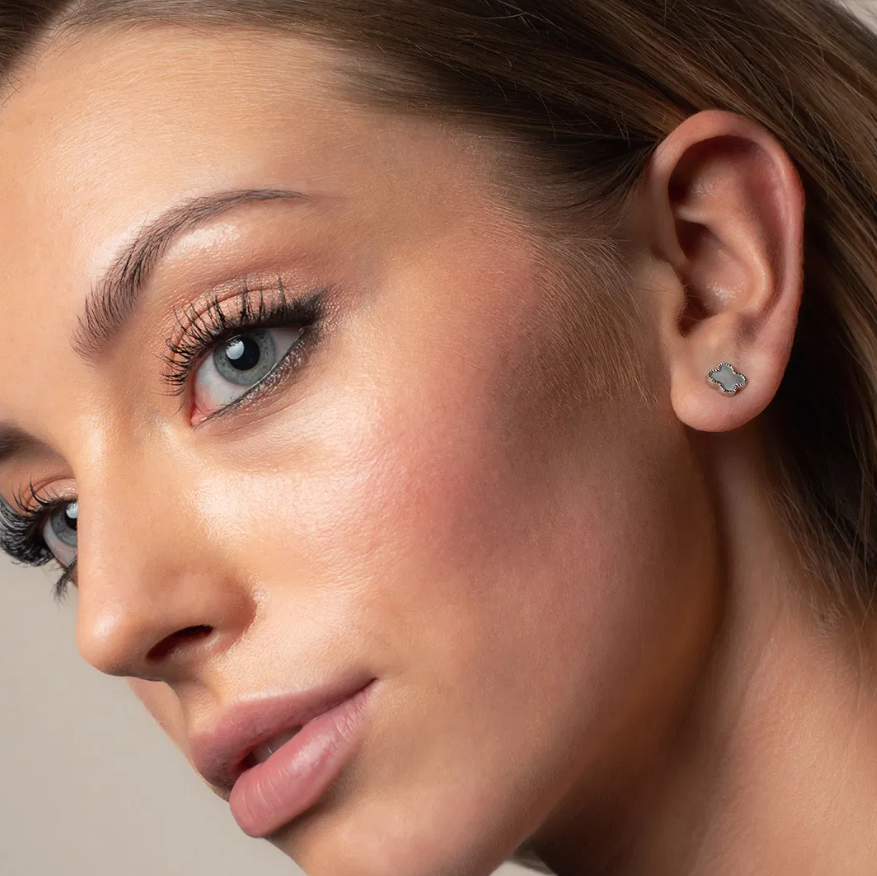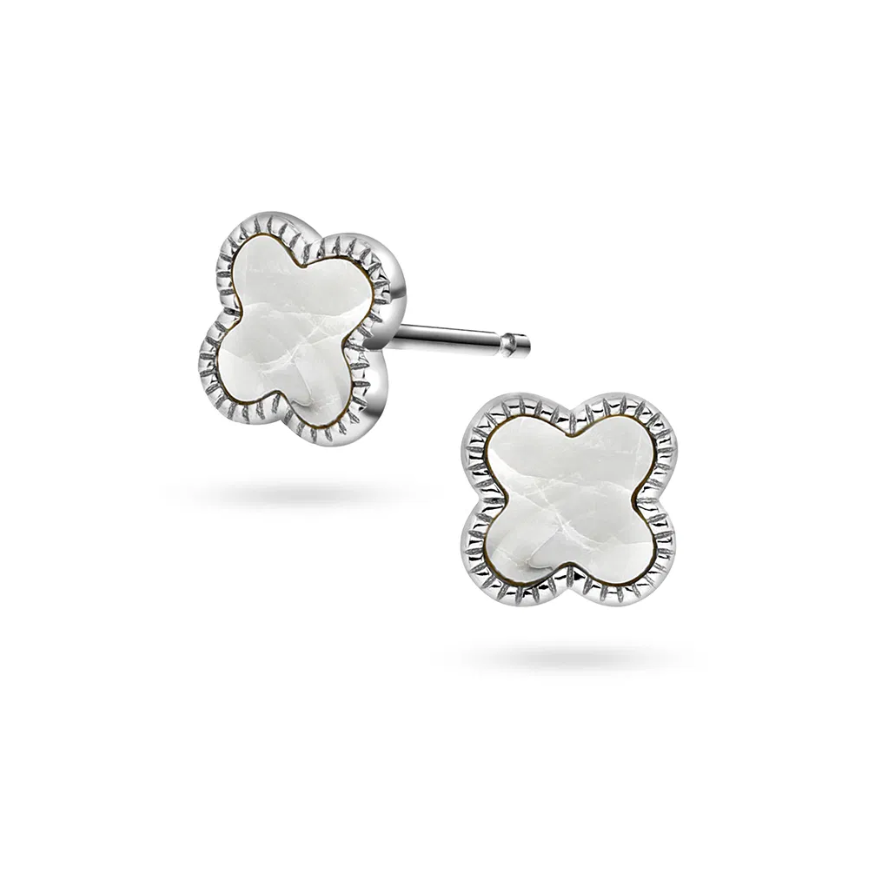 Trendy øredobber i sølv med kløver av hvit perlemor. Kommer med tilhørende smykke og armbånd, samt i flere farger.