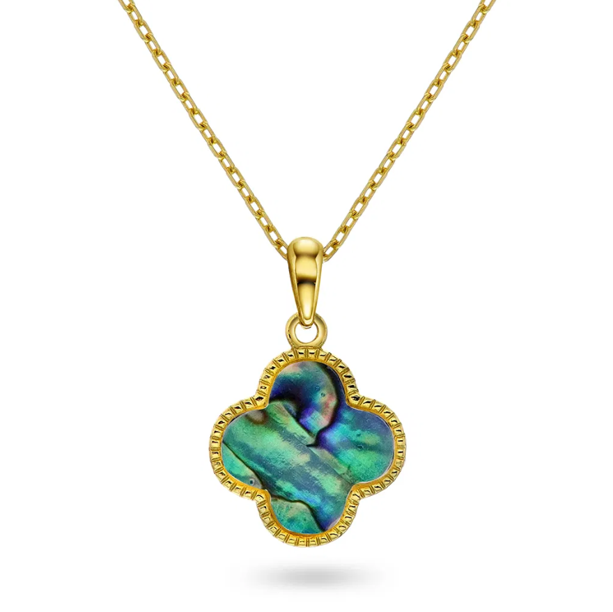 Trendy smykke i forgylt sølv med kløver av abaloneskjell. Kommer med tilhørende armbånd og ring, samt i flere farger.