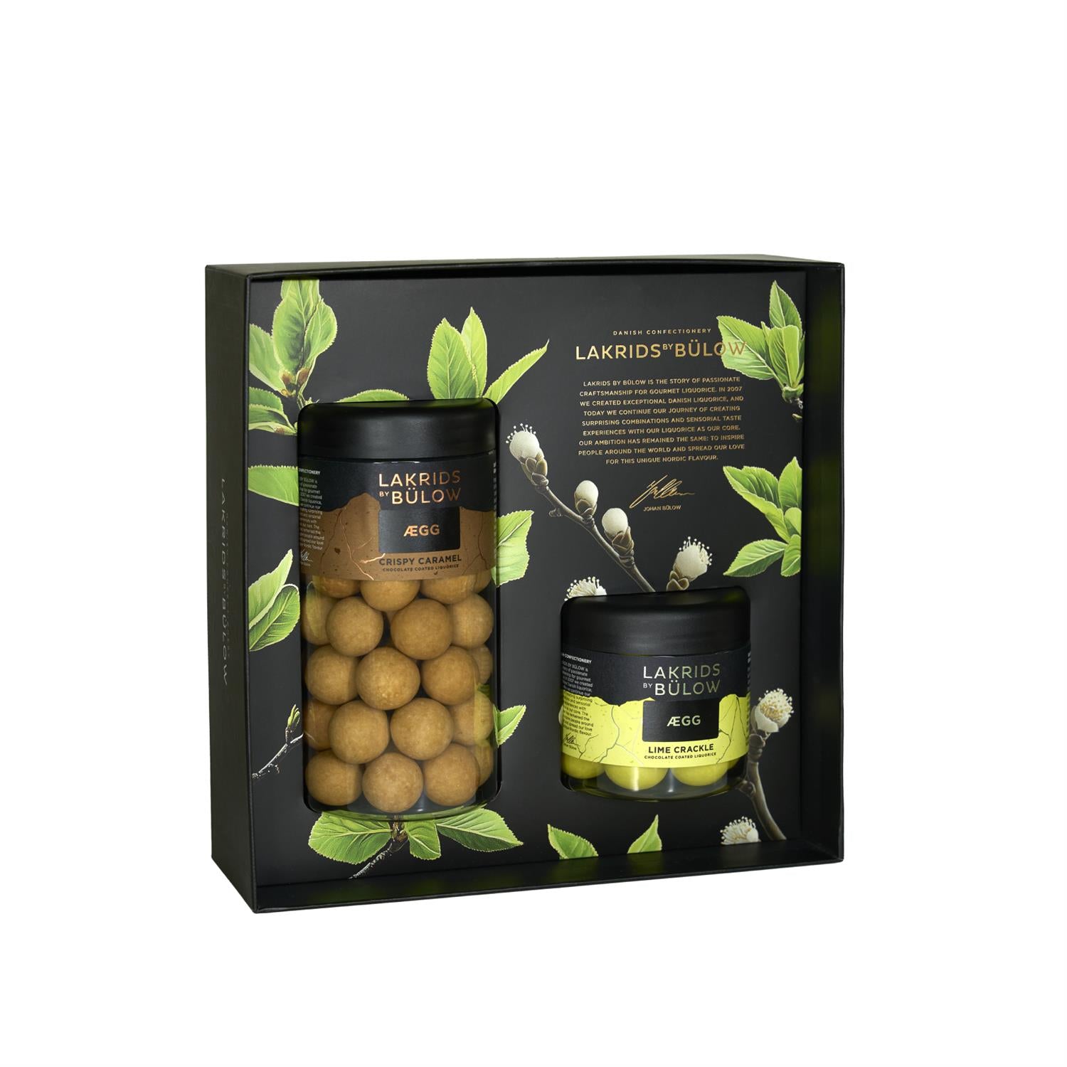 I denne BLACK BOX får LIME CRACKLE og CRISPY CARAMEL skinne i en ekte smakssensasjon. LIME CRACKLE er en frisk sammensmeltning der en kjerne av saltlakris møter saftig lime og kremet hvit sjokolade. Dulcesjokolade er perfekt virvlet sammen med rålakrispulver i vår CRISPY CARAMEL. Opplevelsen er fullkommen.