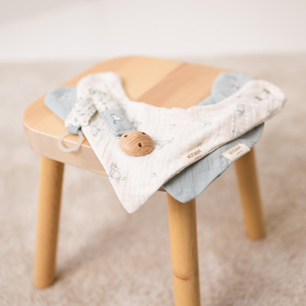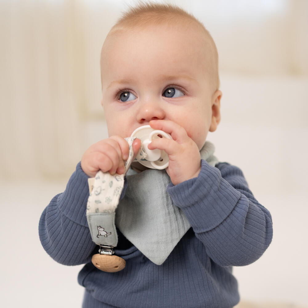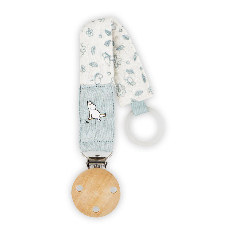 Med en sikker treklips og en myk, slitesterk stoffstropp, holder den smokkene lett tilgjengelig og forhindrer at de mistes eller blir borte. Stroppen har sjarmerende Mummi-illustrasjoner.