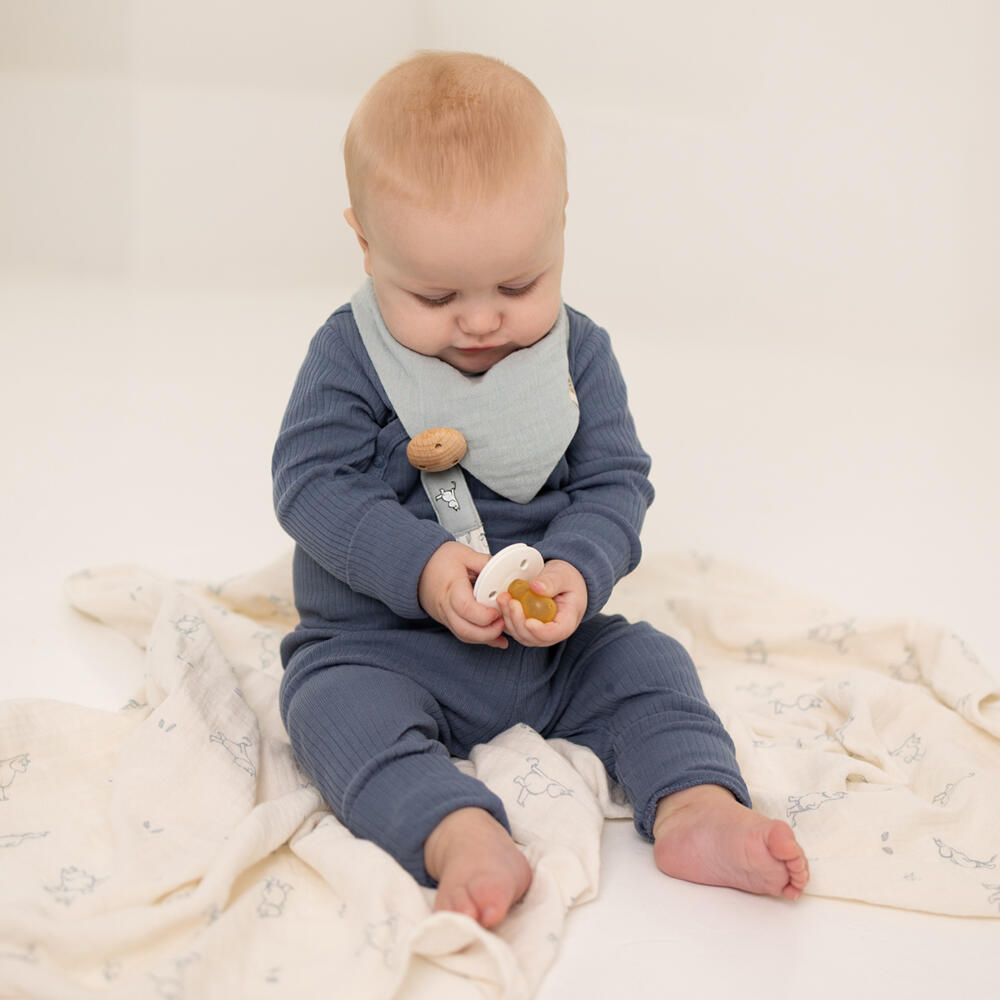 Mummi smokkeklemme i blått er et pent og praktisk tilbehør for babyer. Design fra Mummiverden som gir et lekent preg.