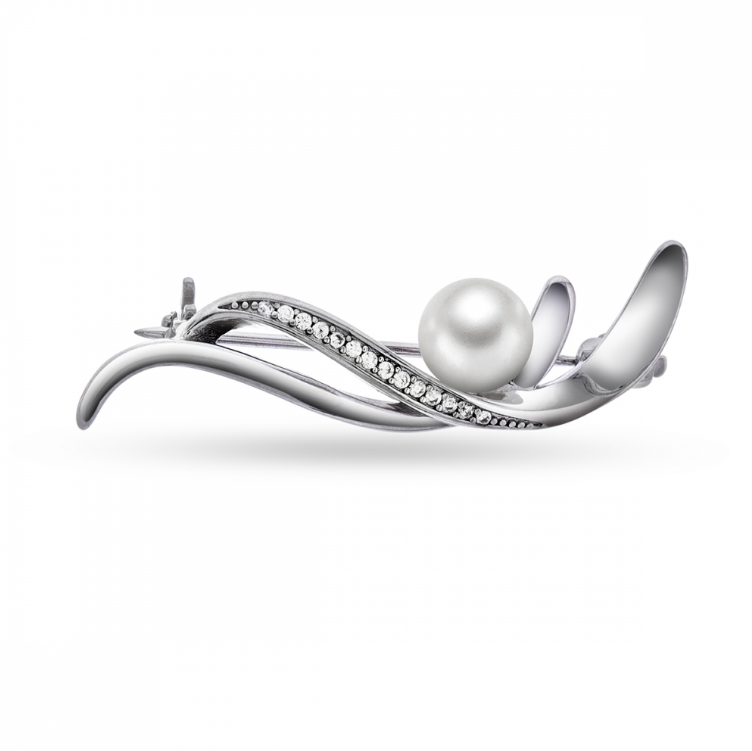 Brosje/nål i rhodinert sølv med perle og hvit zirkonia. Pynter opp antrekket - enten det er til hverdags eller fest.