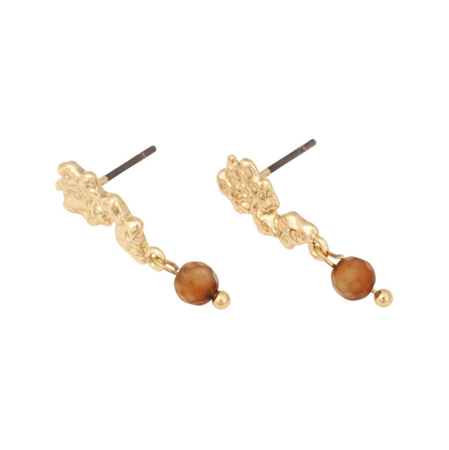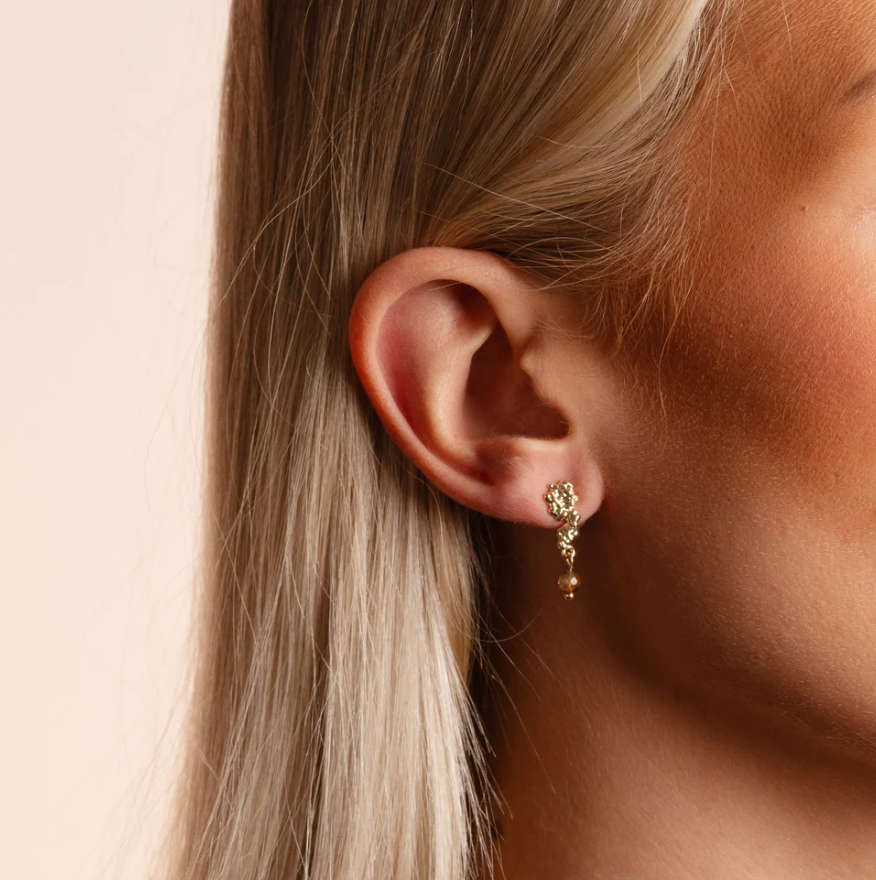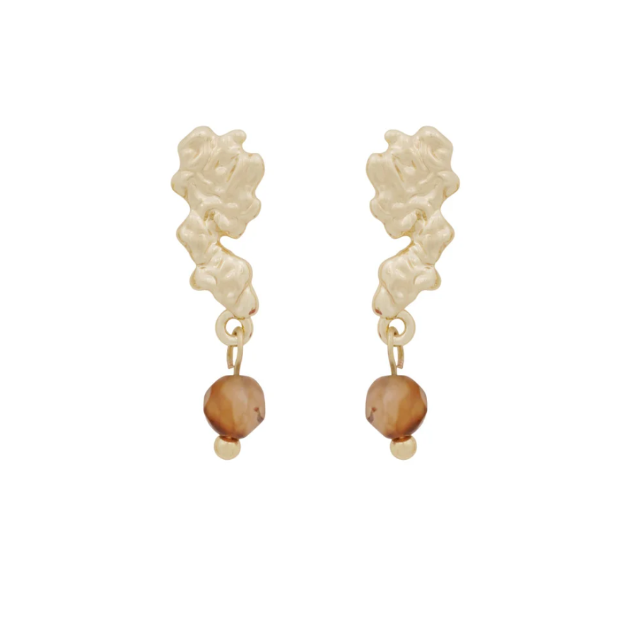 Øredobber med bølget, teksturert form og en hengende perle i enden. En raffinert blanding av overflatedetaljer og myk eleganse.