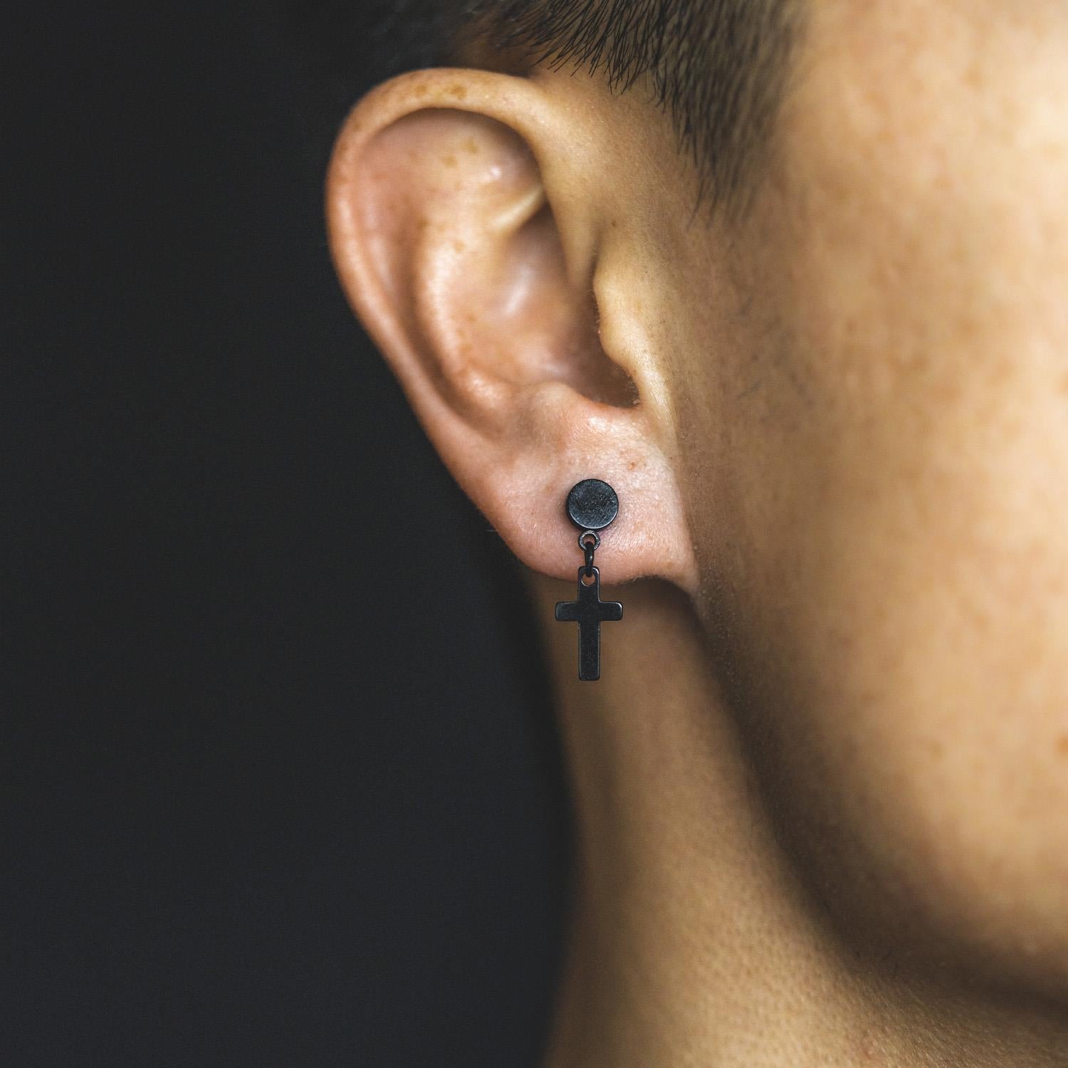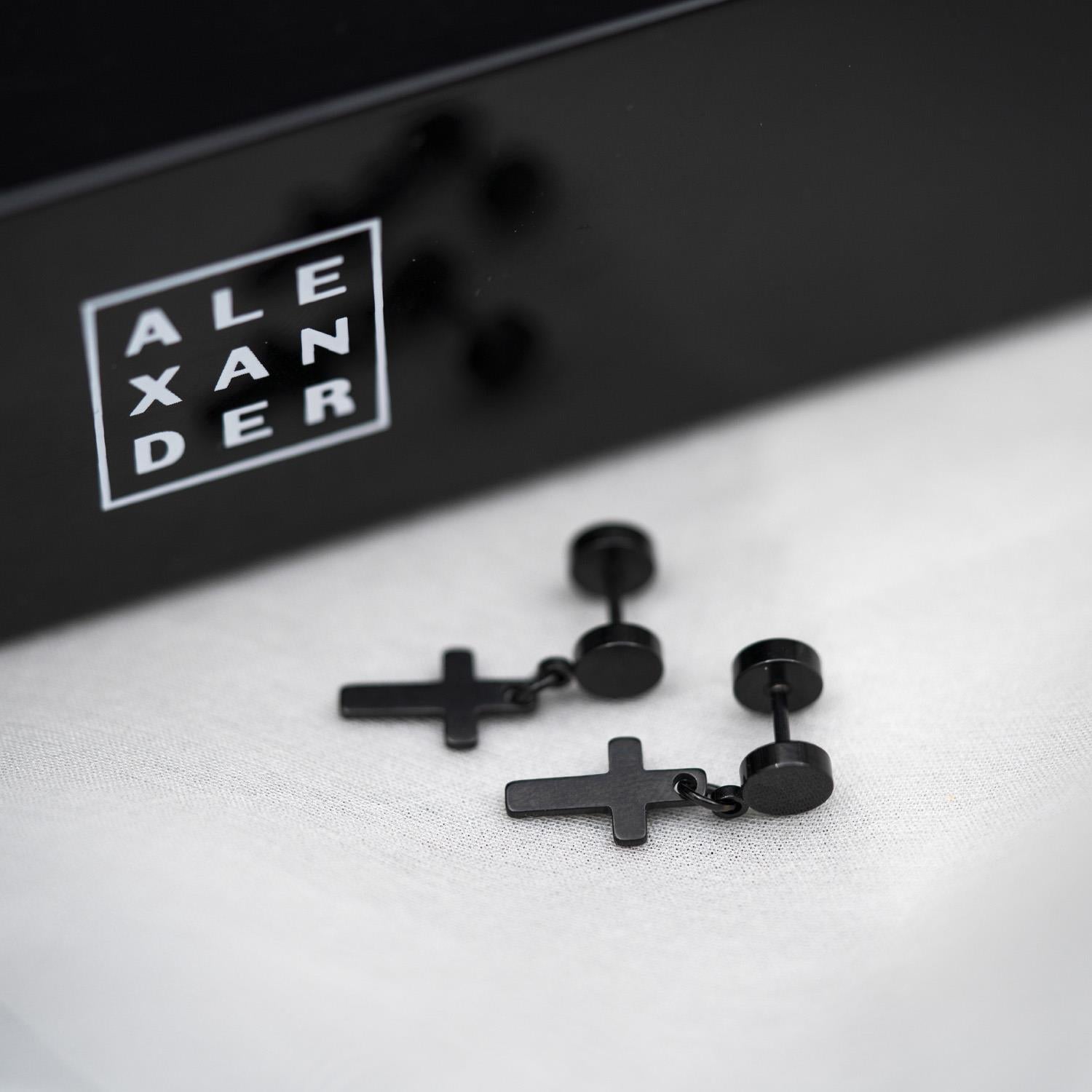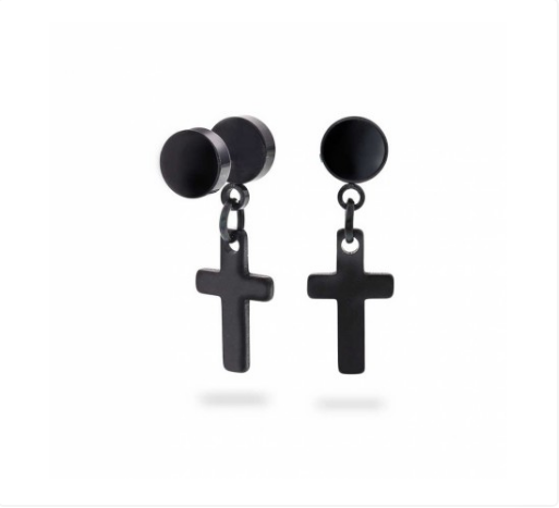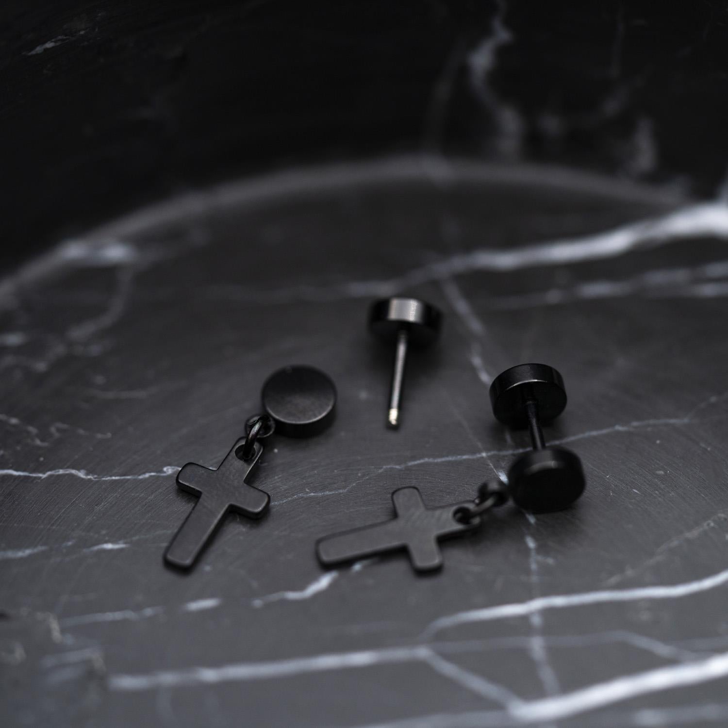 Tøffe hengende sorte ståløredobber med kors. Leveres som ett par.