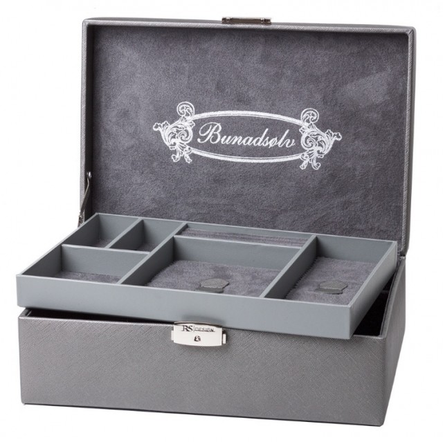 Dette flotte skrinet er perfekt for oppbevaring av bunadssølv. Med en eksklusiv utside og en matchende innside, har det en løs innsats med 6 inndelte rom for de ulike bunadsdelene. Skrinet har også god plass i bunnen, ideelt for veske og belte.